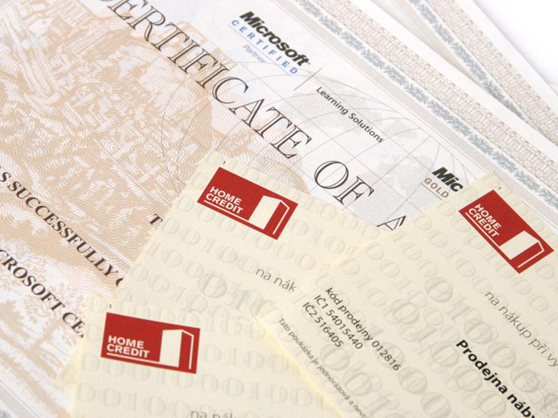 Unikátní, složitě napodobitelná a nekopírovatelná grafika. Certifikáty a dárkové kupony s ochrannými prvky. Základem je unikátní papír s vodoznakem a dalšími ochrannými prvky. Giloše, speciální barvy, slepotisk a ražba jsou další prvky pro ochranu před napodobením a kopírováním.