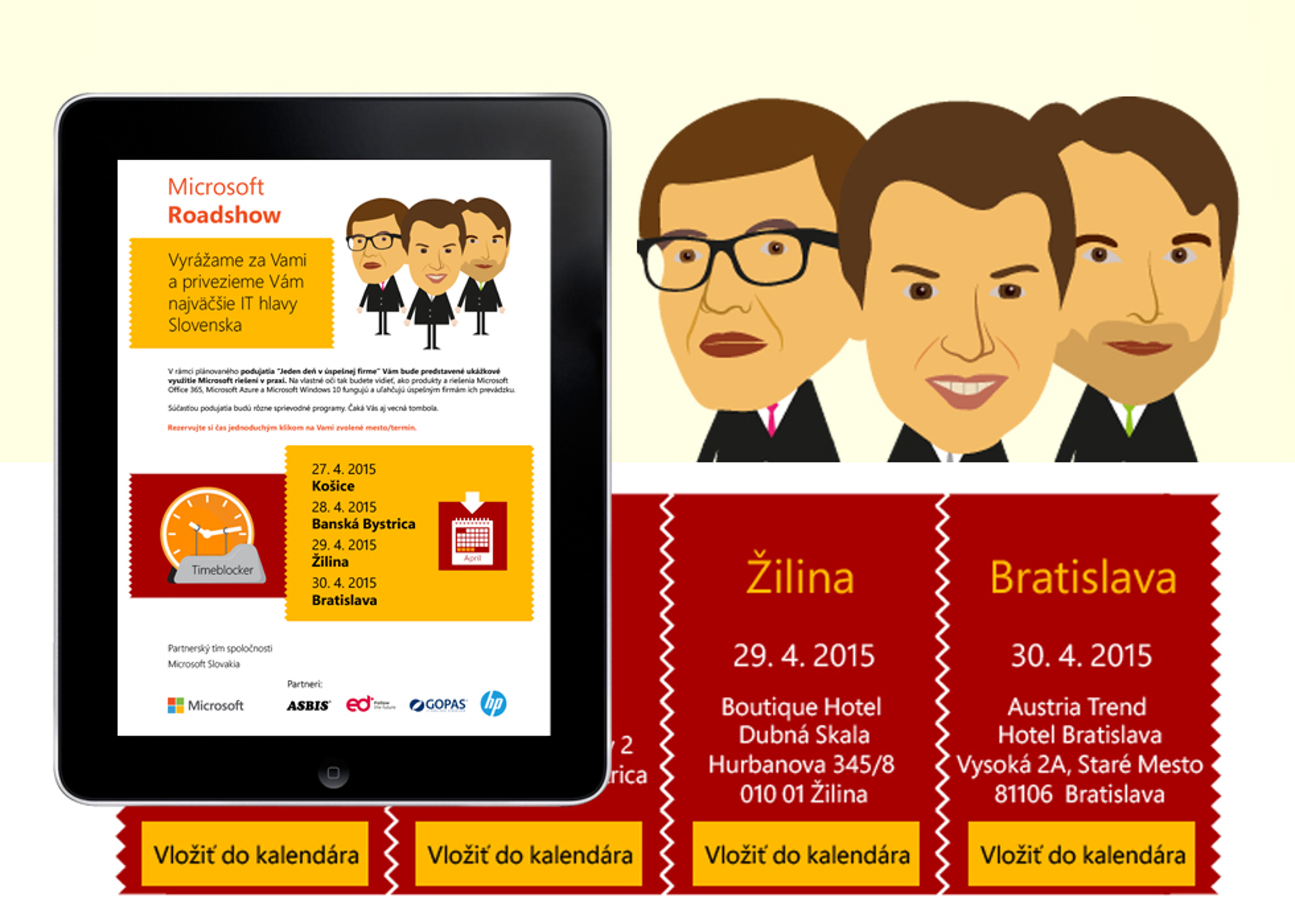 Na naše grafiky čekala kreativní práce při zhotovování grafického návrhu, včetně ilustrací a karikatur pro timeblocker a pozvánku na připravovanou Microsoft Road Show na Slovensku. Oboje získalo finální podobu ve formě HTML e-mailu s možností snadného automatického vložení události do kalendáře