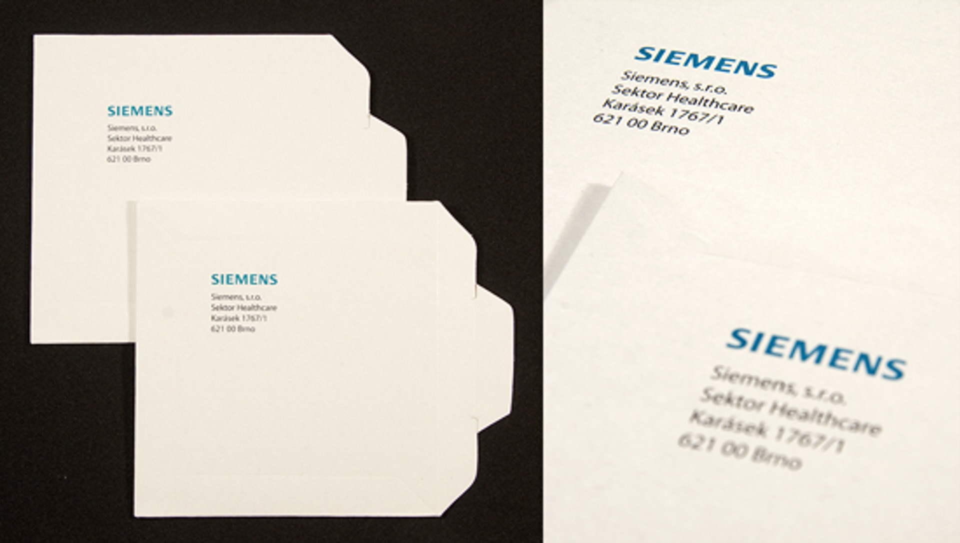 Pro společnost Siemens, s.r.o.,jsme kompletně obstarali několik set kartonových obálek na CD i s aplikací adresy firmy pomocí potisku.