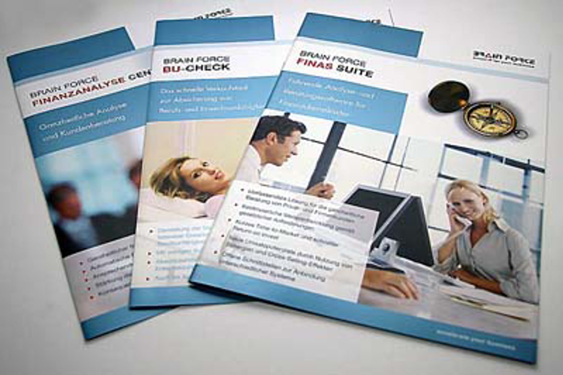 Pro našeho stálého zahraničního klienta společnost Brain Force jsme tiskli sadu letáků o výsledném formátu A4 v několikatisícovém nákladu. Specialitou této zakázky bylo použití přímé metalické barvy. Nakonec ještě byla provedena finální úprava ofsetovým lakem.