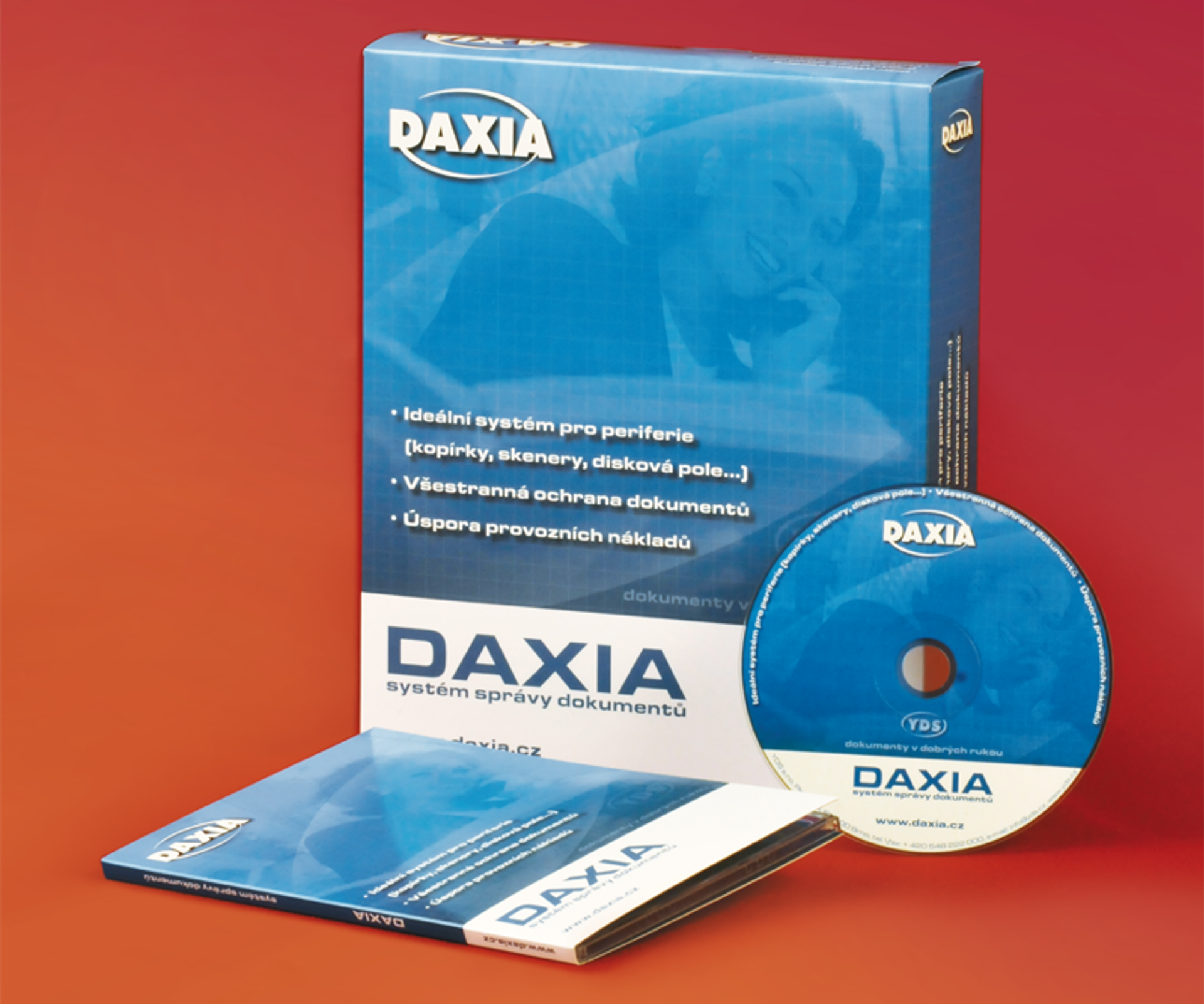 Zcela kompletní realizace obalů na software, a to od grafického návrhu, vytvoření samotného loga DAXIA a nosné produktové fotografie. Provedení grafiky obalu CD, manuálu pro uživatele, polepu CD a samotných krabic v jednotném designu. Kvalitní ofsetový tisk obalu, krabice a manuálu doplněn digitálním potiskem CD.