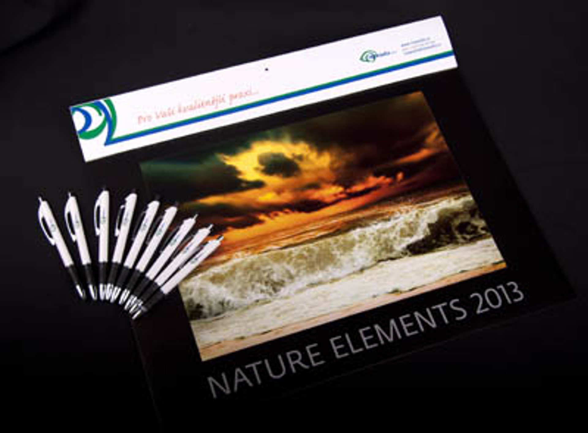 Pro našeho dlouholetého klienta, firmu MeWAdia, jsme zajistili několik set kusů nástěnných kalendářů na rok 2013 a také plastová kuličková pera. Tyto třináctilisté kalendáře jsou ve vynikající fotokvalitě s neutrálním kalendáriem a lakovanou obálkou. Na laše jsme aplikovali firemní logo a slogan použitím potisku bílé samolepky. Dále jsme realizovali potisk dvou tisíc kusů bílých plastových kuličkových per. Tato pera jsou dle požadavku zákazníka opatřena gumovým úchopem, který zajišťuje pohodlné a příjemné psaní.