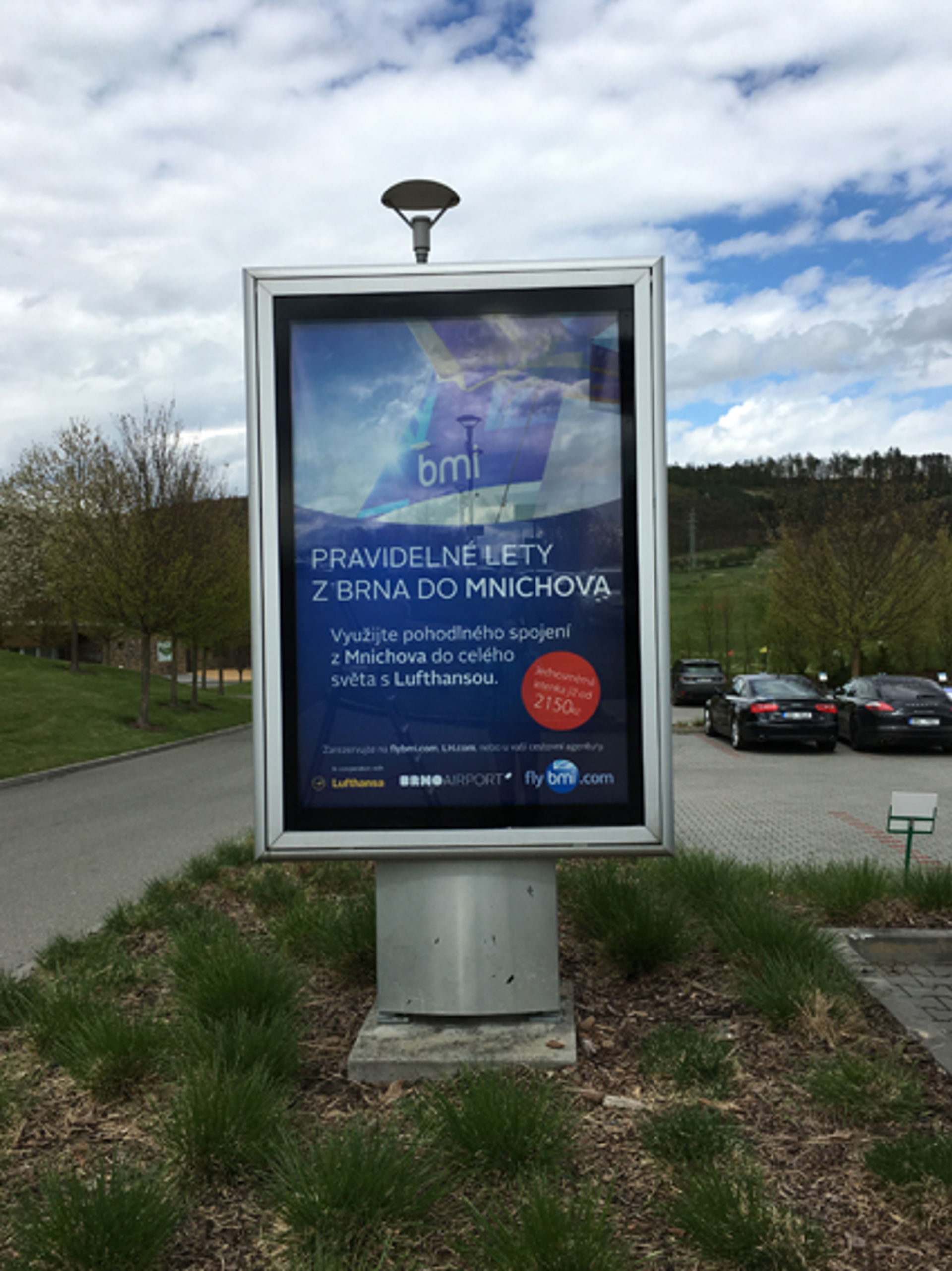 Nejen vytisknout, ale i instalovat reklamu přímo na místě nám není cizí. Protože se jednalo o prosvětlenou venkovní vitrínu, bylo vhodné tisk provést na tzv. translucentní (backlit) film, který je odolný proti ohnutí a zvlnění. Vyznačuje se rovněž snadnou instalací a manipulací.