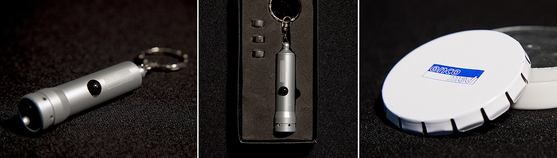 Sadu reklamních předmětů jsme vyráběli pro společnost Oncomed manufacturing a.s. Jednalo se gravírované hliníkové baterky, potiskávané propisky a reklamní bonbónky s aplikací loga na víčko krabičky.