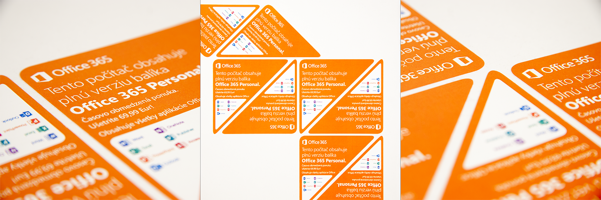 Společnosti Microsoft Slovakia, s.r.o. jsme graficky navrhli a na našem digitálním tiskovém stroji vytiskli reklamní samolepící rohy na PC obrazovky. Jednalo se o tisk několika set kusů rohů na nepermanentní fólii/samolepku určenou pro opakované použití. Následně jsme tyto rohy na našem řezacím plotru vyřezali do konečného tvaru.