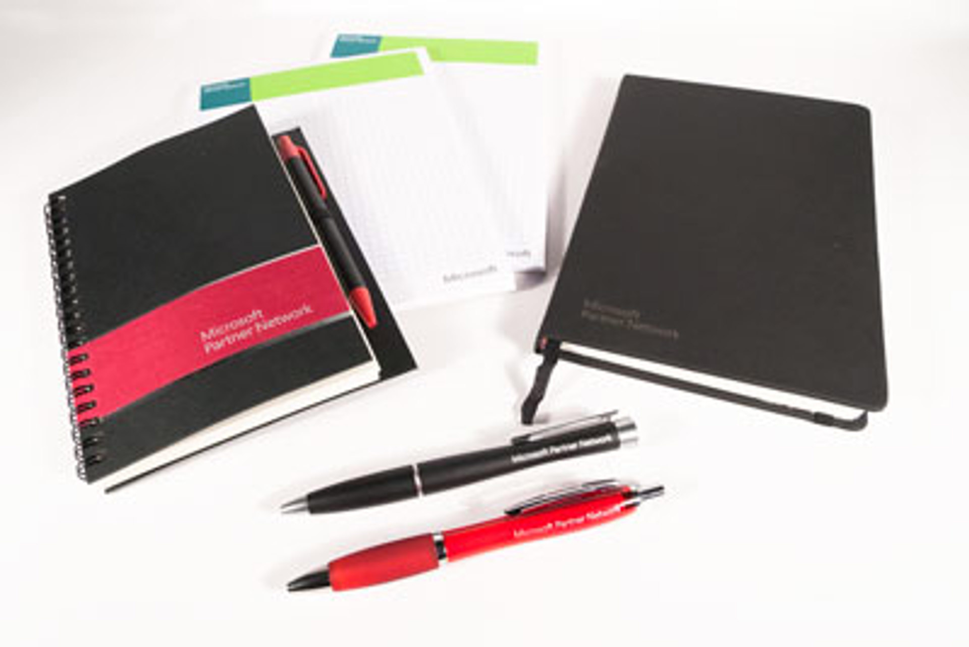 Opět nás požádala společnost Microsoft Slovakia a výrobu a zajištění několika vybraných reklamních předmětů. Jednalo se o patřičně obrandované linkované bloky s kroužkovou vazbou, linkované šité bloky - obojí ve tvrdých deskách. A ve stejném tónu barev jsme připravovali i kuličková pera. Dalším požadavkem byla výroba a tisk lepených bloků ze čtverečkovaného papíru.