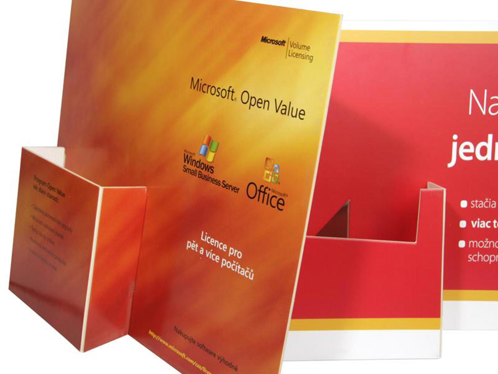 Vyrobili jsme stojánky na letáky, kde je ofsetem potištěný potah kašírován a následným výsekem je stojánek formován do výsledného tvaru.
