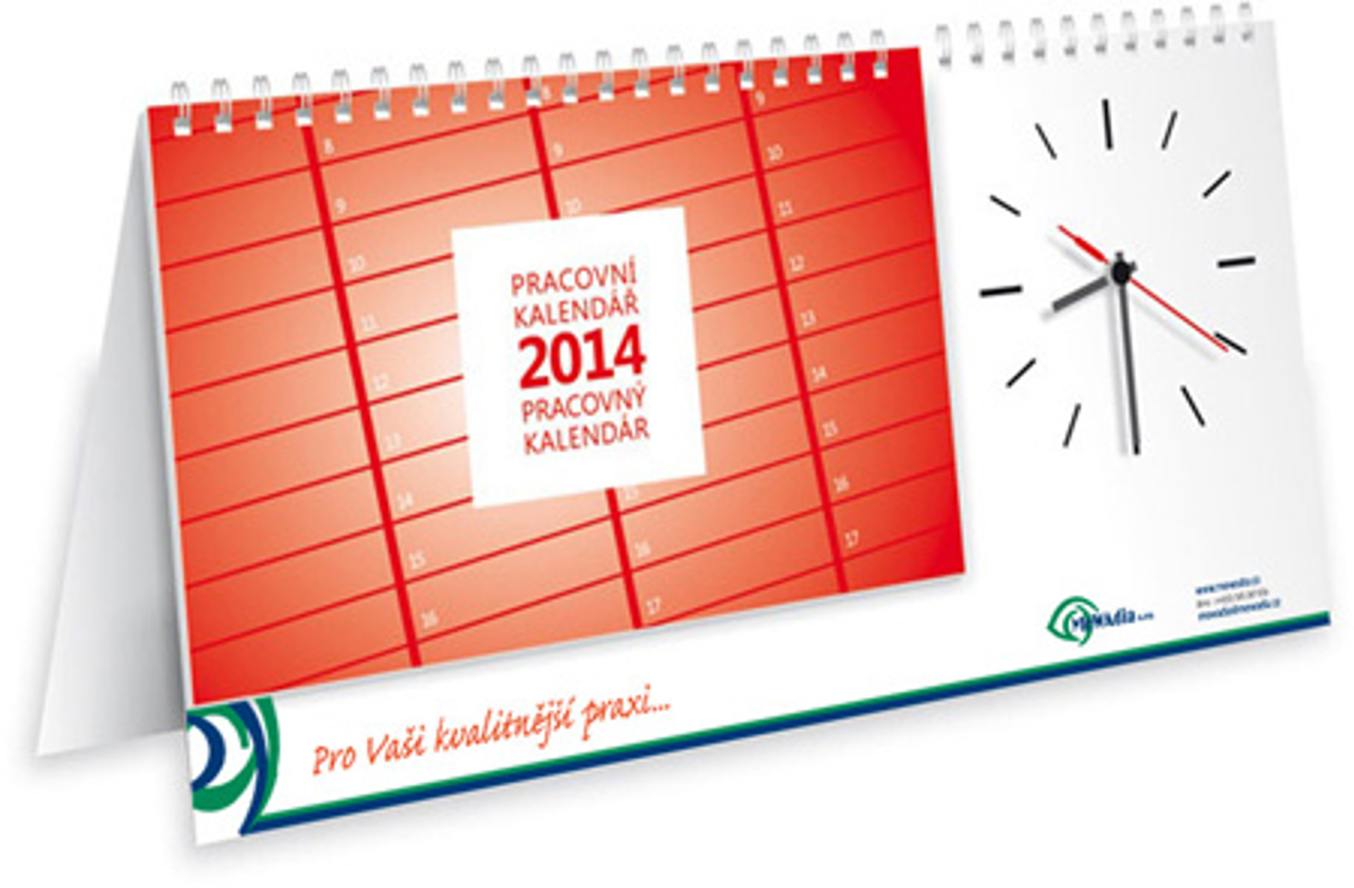 Praktické stolní kalendaře se skutečnými vestavnými hodinami a s aplikací firemního loga a sloganu jsme připravili společnosti MeWAdia, s.r.o. Tento typ kalendáře klasicky dodržuje všechny požadavky každodenního využití, máte jej stále na očích a jsou velice praktické. Kalendář má 58 listů s česko-slovenským kalendáriem. Po uplynutí roku se mohou hodiny odstřihnout a používat je samostatně.Ve spodní části kalendáře jsme aplikovali pomocí digitálního tisku na samolepku firemní logo a slogan.