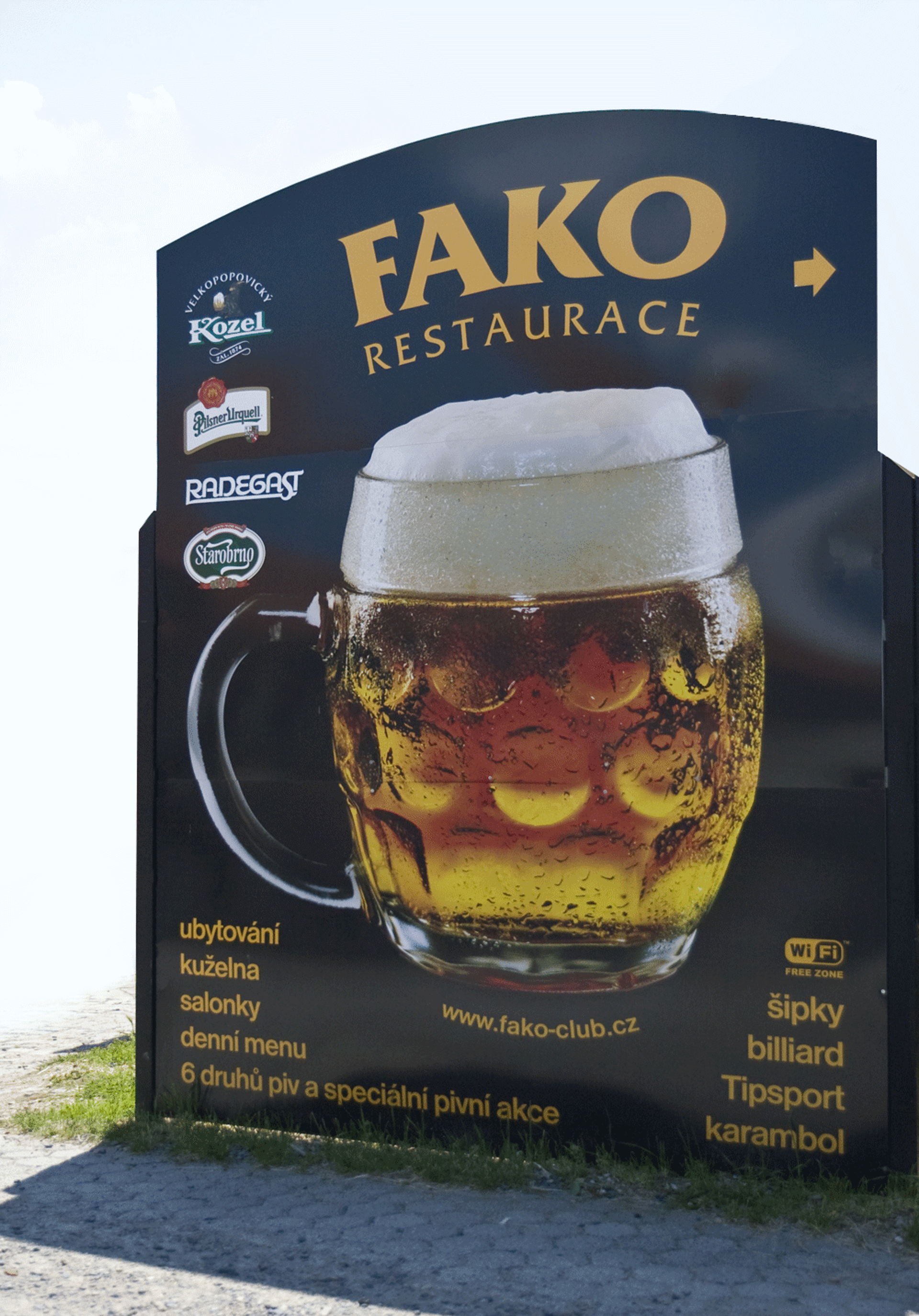 Grafický návrh, ateliérová fotografie, digitální retuš, studiové zpracování, kompletní výroba a instalace venkovního poutače pro restauraci, penzion a kuželnu na Hasičské 18 v Brně - Tuřanech.