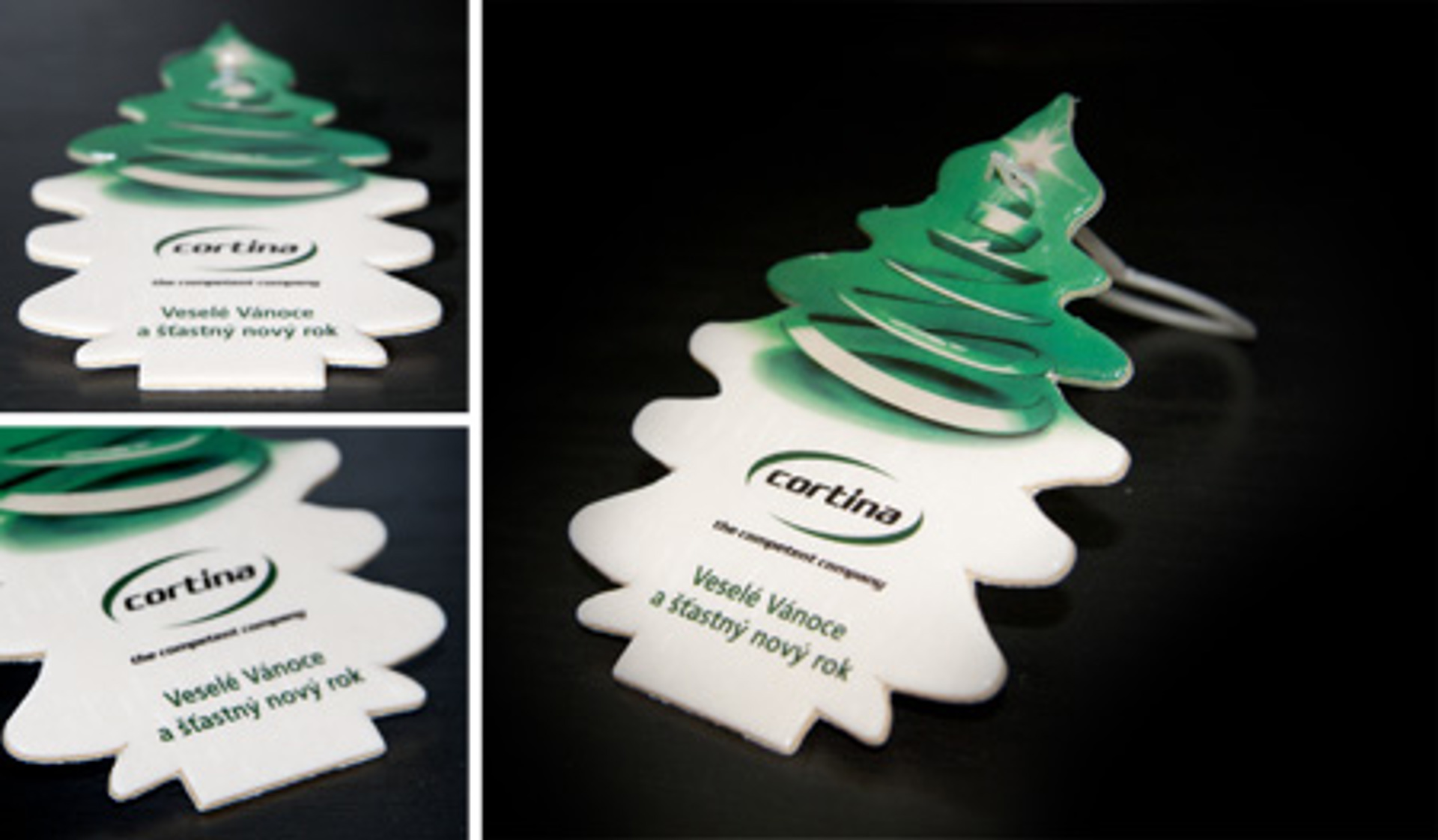 Pro společnost Cortina Development spol. s r.o. jsme připravili několik stovek vonných visaček ve tvaru stromečku. Následným potiskem jsme na stromečky aplikovali logo společnosti a firma tak má nyní zajímavý a originální dárkový předmět pro své klienty.